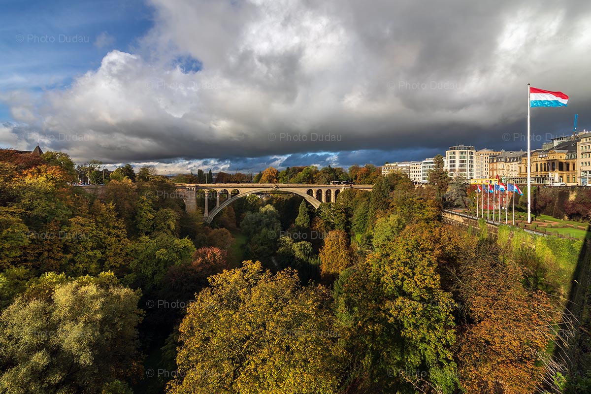 Commercial photo of Pont Adolphe over Petrusse Valley during cloudy autumn morning with golden trees and Luxembourgish flag waving in the wind.