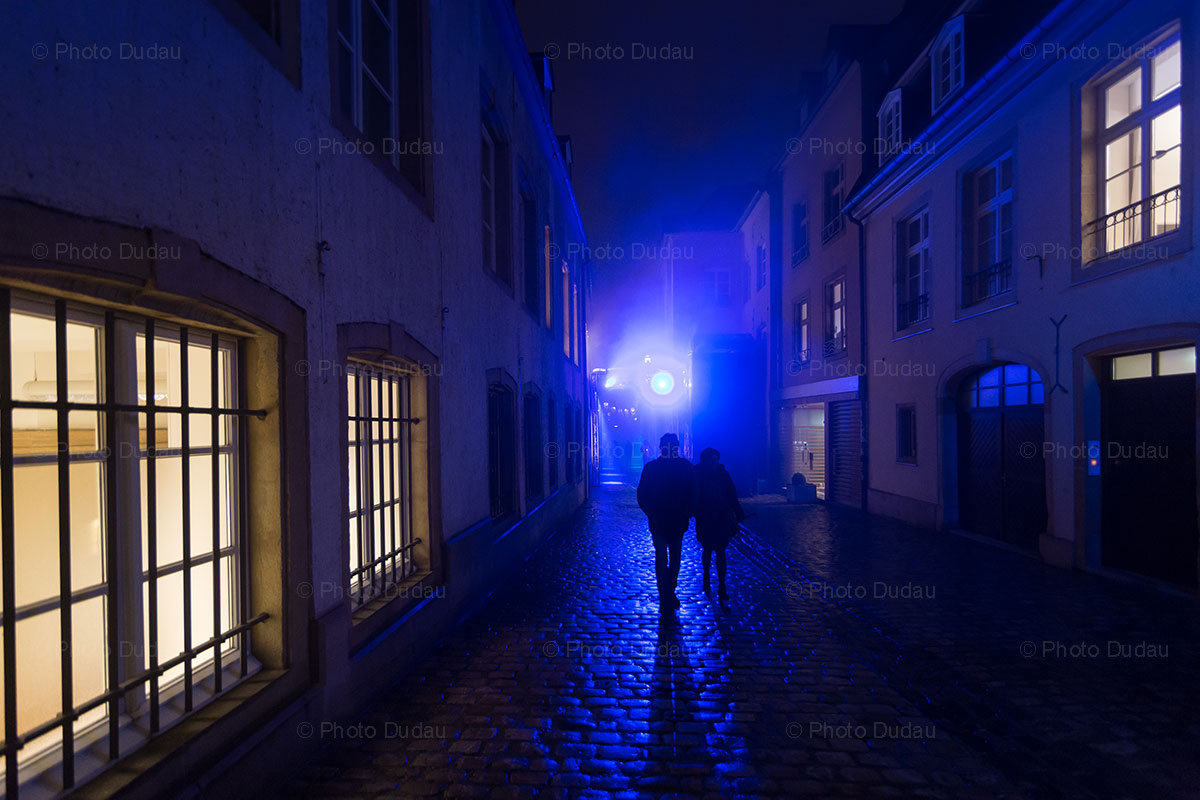 Commercial photo of people walking on blue illuminated street in downtown Luxembourg city during Winterlights festival on 15 December 2017.