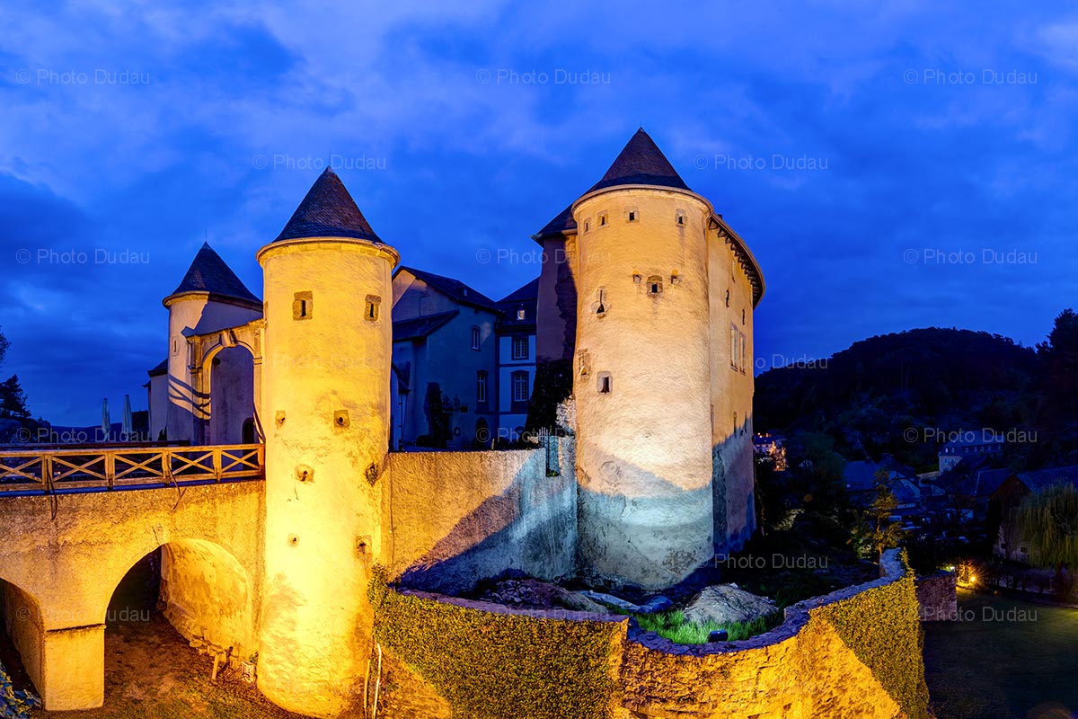 Commercial photo of illuminated Bourglinster Castle at night in the Grand Duchy of Luxembourg.