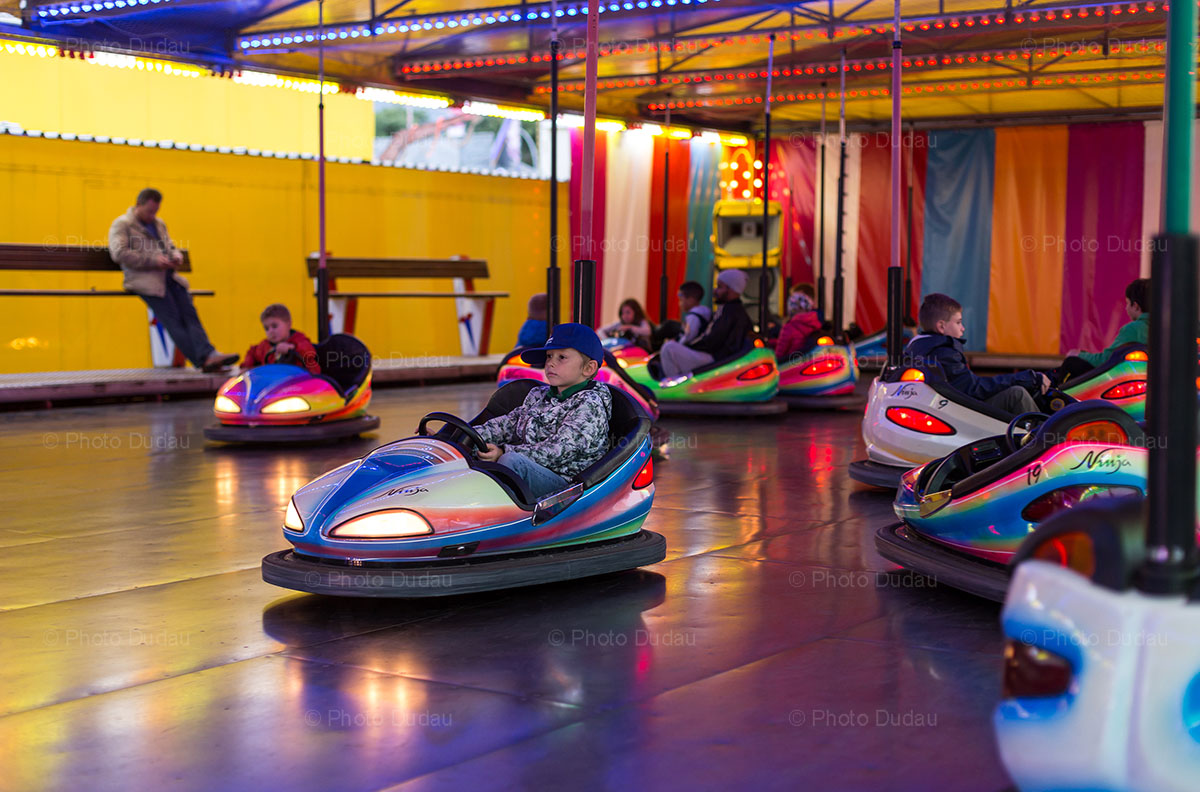 Editorial image of kids playing and riding bumper cars at Schueberfouer 2017 funfair in Luxembourg city.