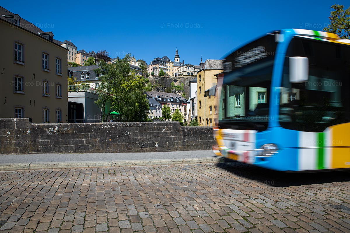 Commercial photo of public bus driving in Grund, Luxembourg city during a sunny summer day.