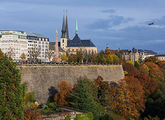 Luxembourg city skyline in autumn with landmarks seen over Petrusse Valley
