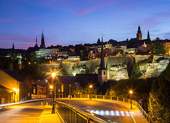 Luxembourg city downtown at dusk during blue hour, showing Notre Dame Cathedral from above.