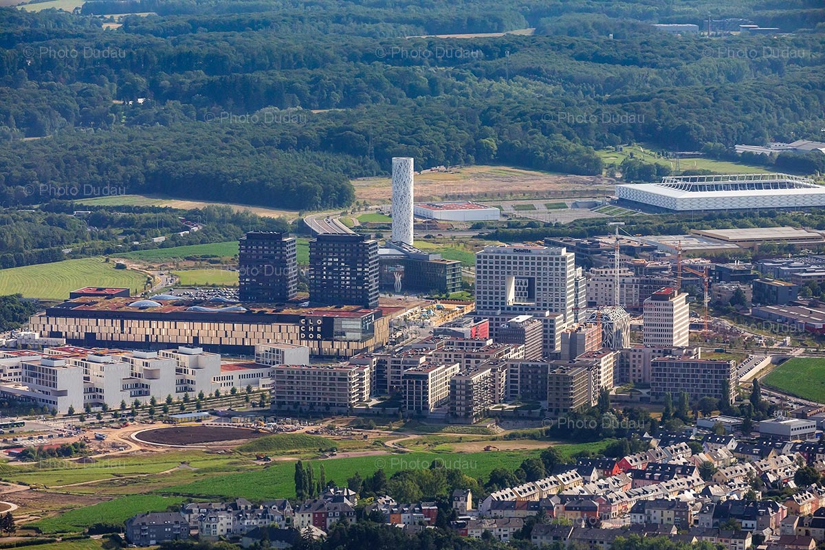 Commercial aerial photo of new modern office buildings and apartment blocks in Cloche d’Or, New National Stadium in Gasperich, Luxembourg city seen from above.
