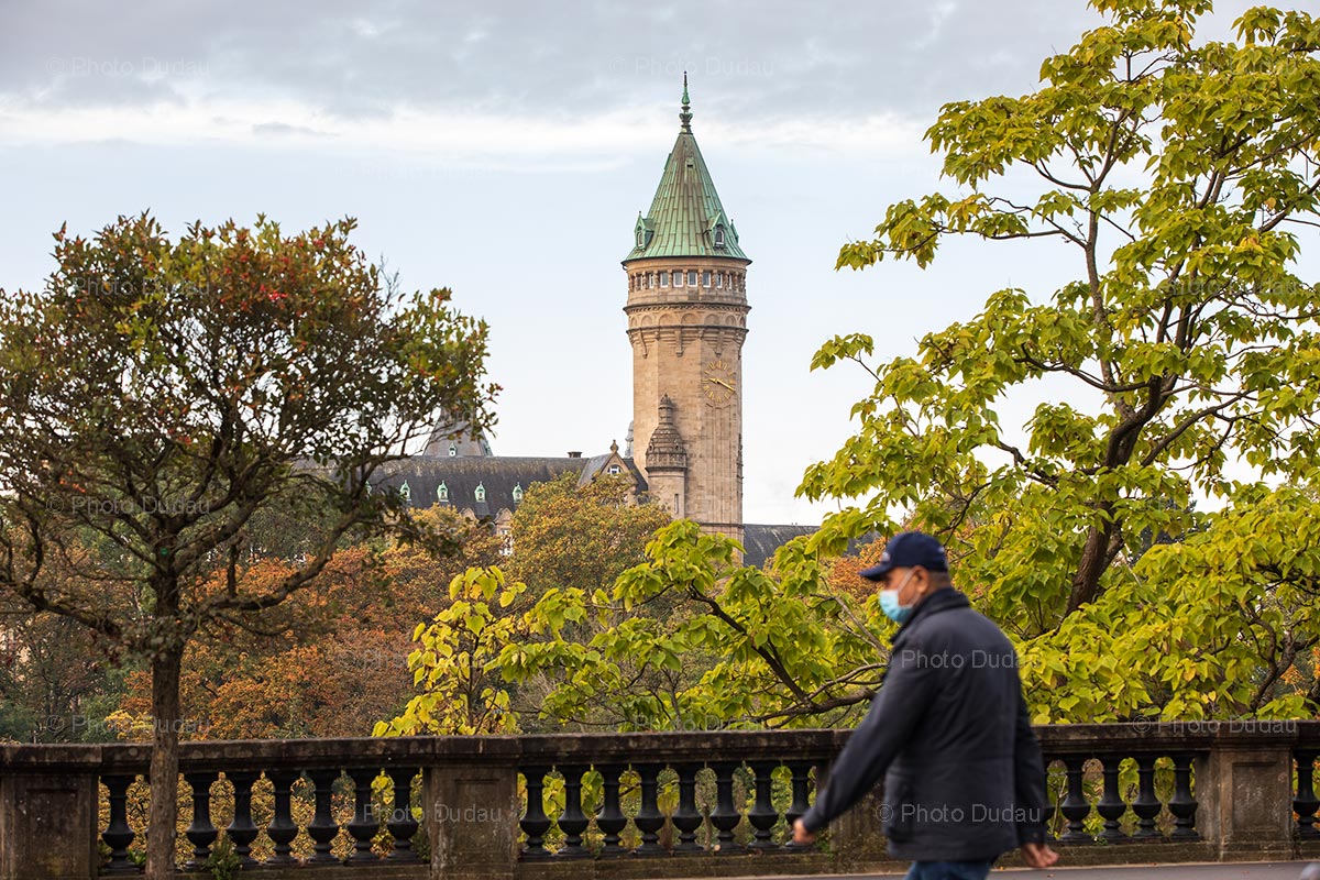 Editorial photo of unidentifiable (not in focus) man wearing protective medical face mask while walking in Luxembourg city downtown, with State Savings Bank Spuerkeess tower in the second plan.