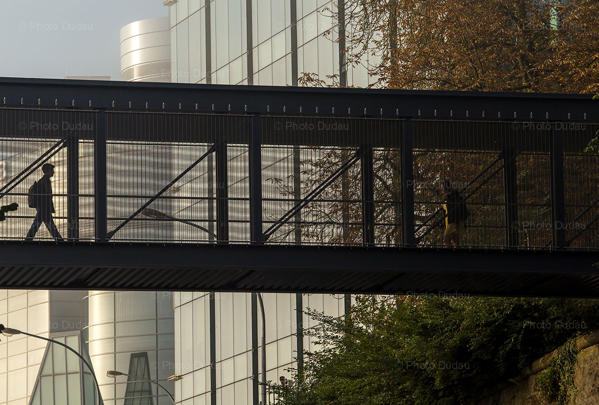 Commercial stock photo of business scene with man in suit with backpack getting out of Pfaffenthal Lift passage in Luxembourg city heading to work. Office building in background.