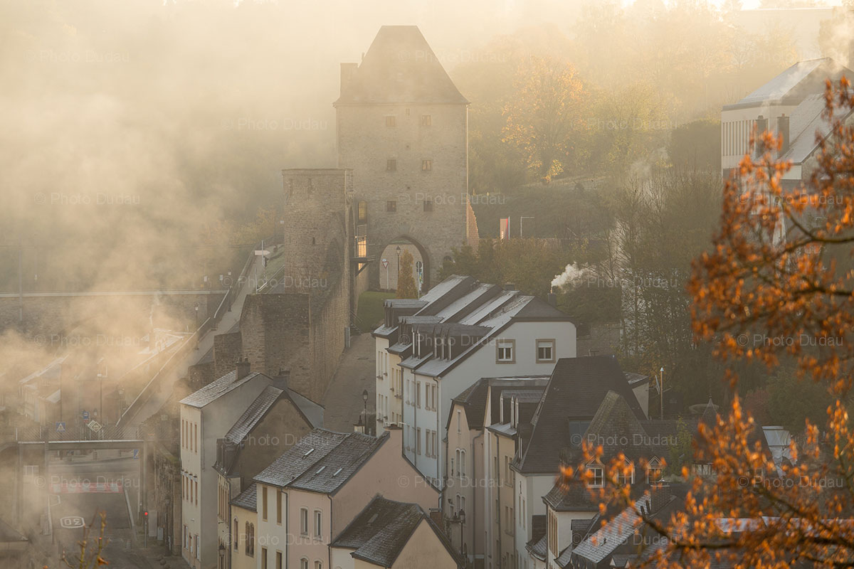 Commercial photo of Rham Plateau in Luxembourg city during a foggy autumn morning.