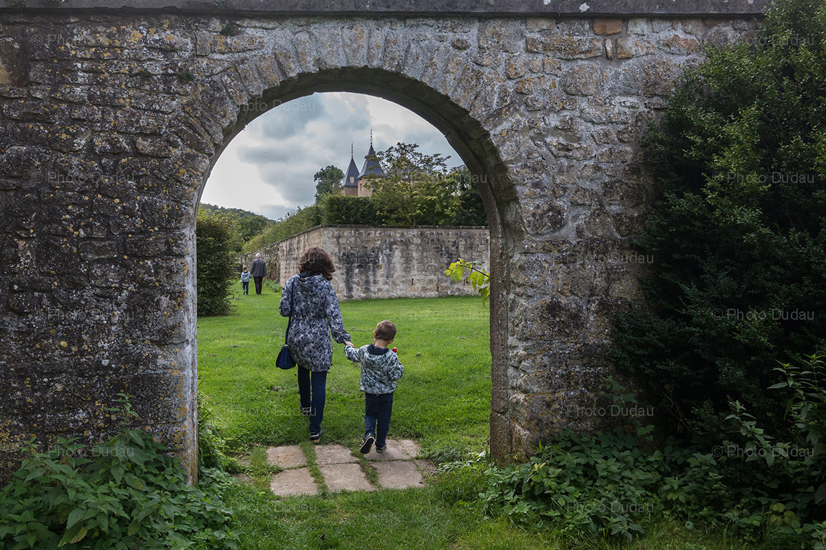 Commercial stock photo of family visiting the gardens of New Castle of Ansembourg in the Valley of seven castles, Luxembourg.
