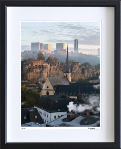 Commercial stock photo of Grund, with Abbaye de Neumunster, Bock Casemates and Kirchberg in background, Luxembourg city old town.