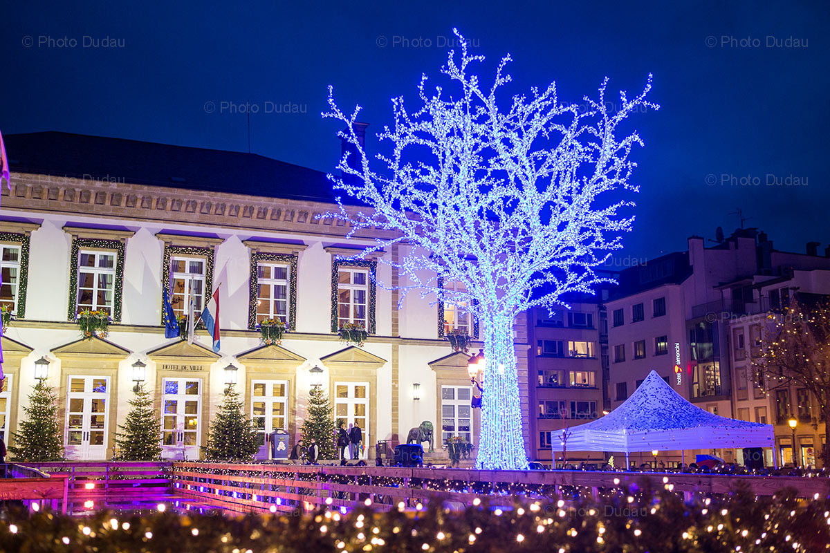 Editorial stock photo of Christmas lights and decorated fir trees in Luxembourg city, in front of City Hall on 22 November 2016, during Winterlights event.