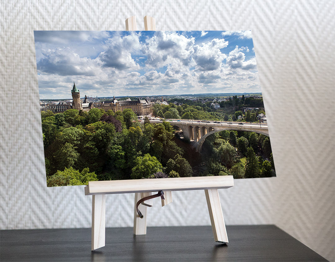 Commercial stock image of Luxembourg city aerial view of downtown showing landmarks: Spuerkeess tower and Pont Adolphe bridge over Petrusse Valley.