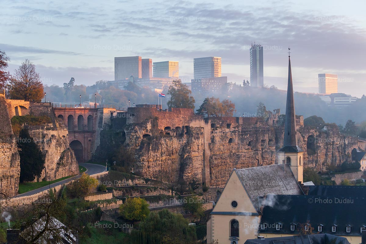 Commercial stock photo of Luxembourg city architecture with Grund, Abbaye de Neumunster, Bock Casemates and Kirchberg in background, view over Luxembourg city old town.