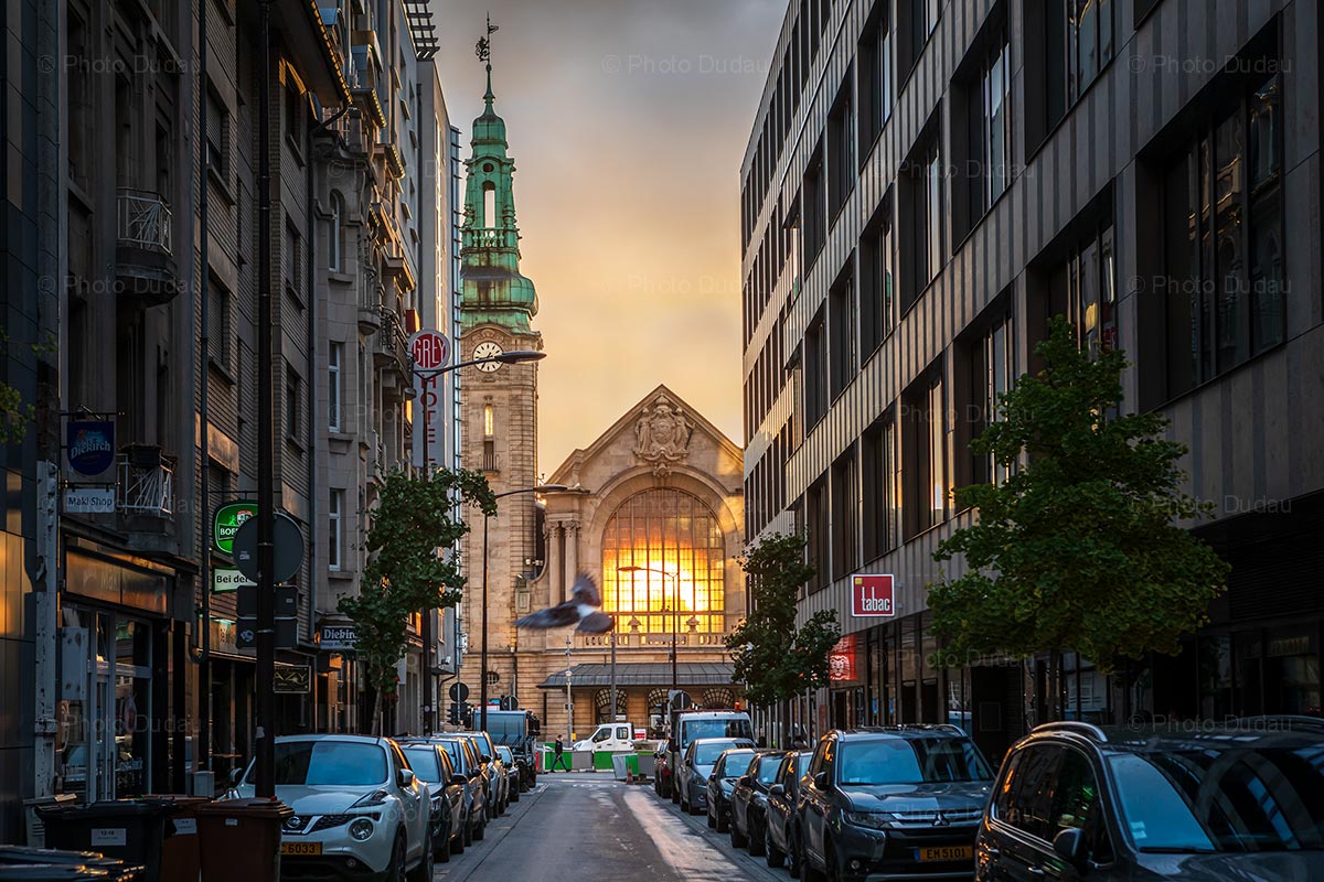 Editorial photo of Luxembourg city train station in the Gare quarter at sunrise.