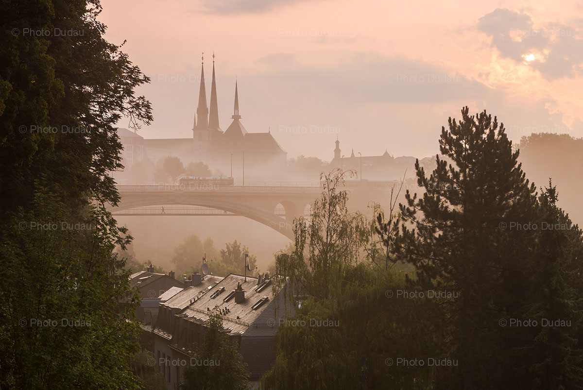 Commercial photo of Pont Adolphe bridge and Notre Dame Cathedral seen from over the Petrusse Valley in a foggy morning sunrise in Luxembourg city.