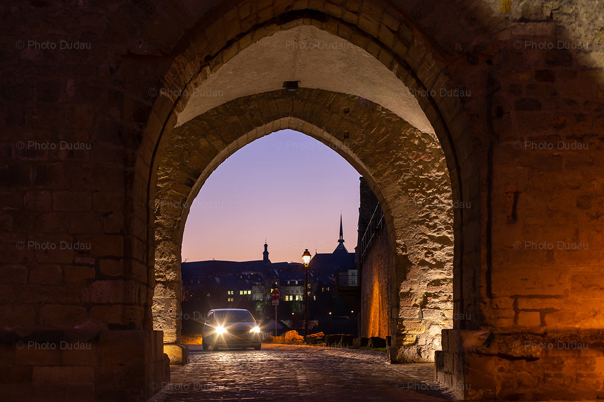 Commercial photo of car driving on a cobbled street through the gate of Rham Plateau in Luxembourg city at night.