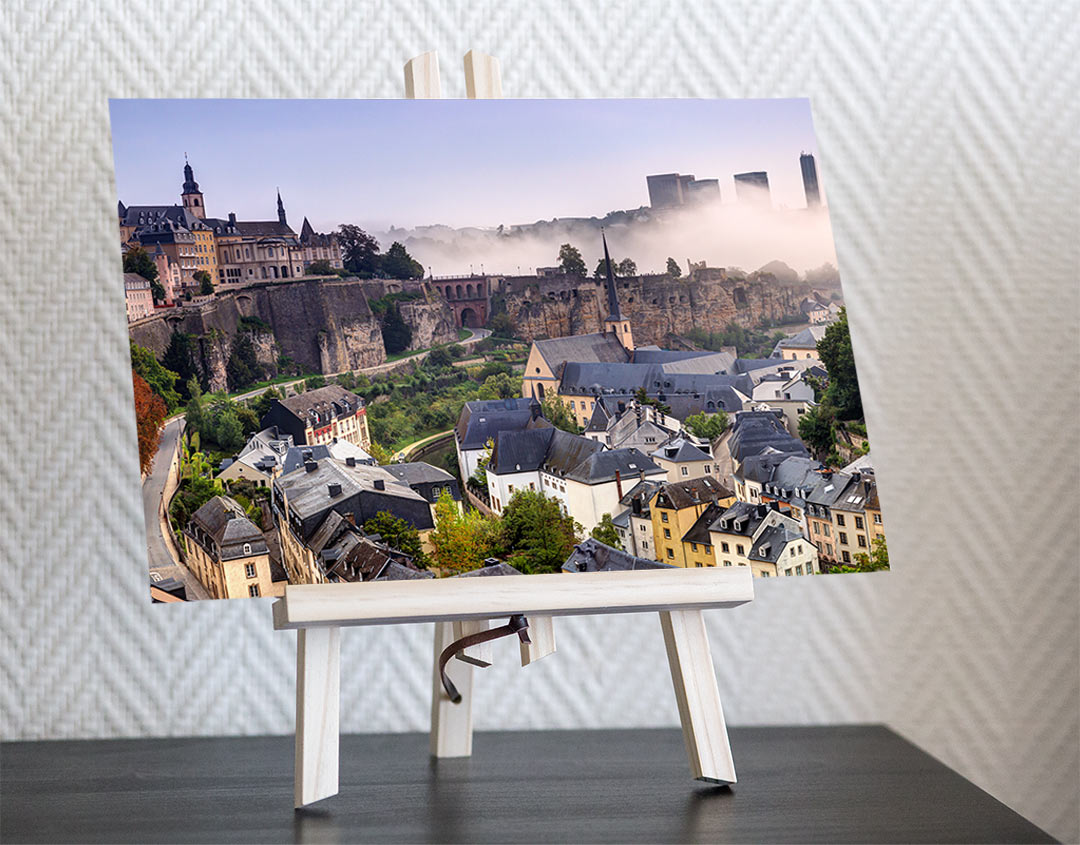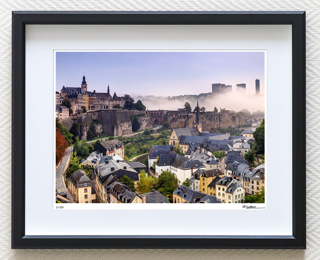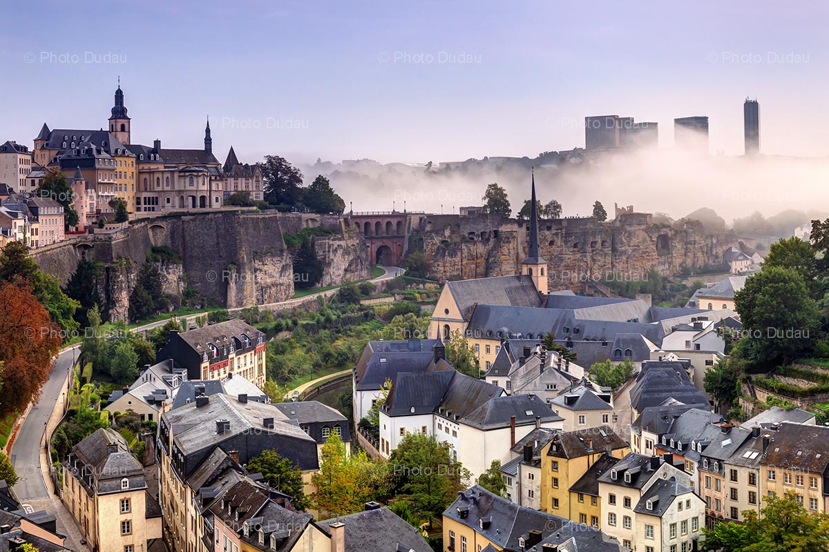 Commercial photo of Luxembourg city cityscape showing Grund with Neumunster Abbey, Chemin de la Corniche, Saint Michael Church, Castle Bridge, Bock Casemates and foggy covered European Quarter Kirchberg.