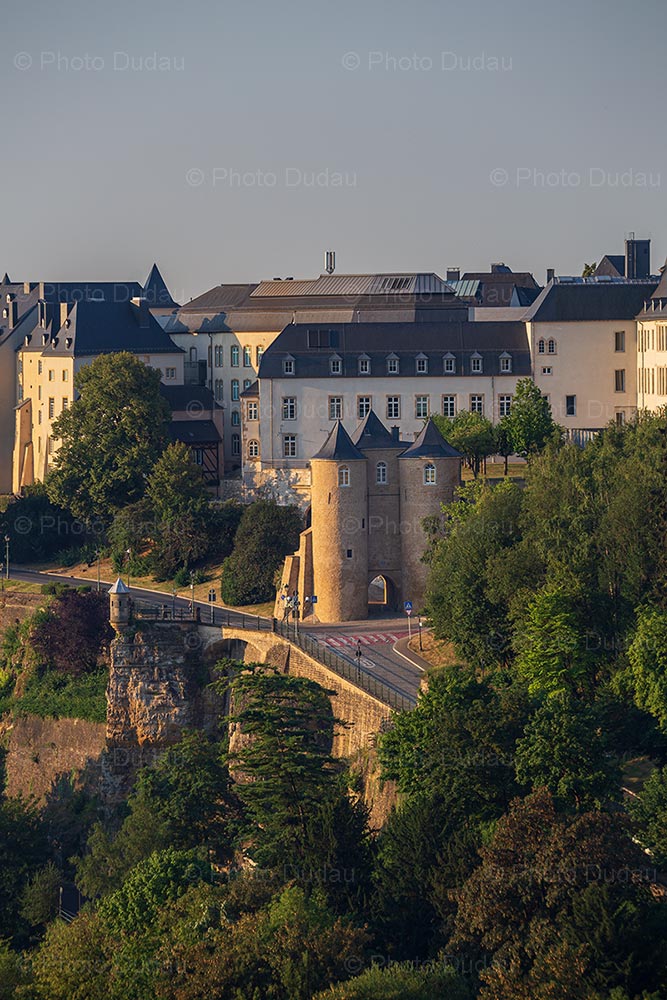 Commercial photo of the medieval Three Towers Gate in Luxembourg city, with Spanish Turret and the old fortress wall in the lower part of the image.