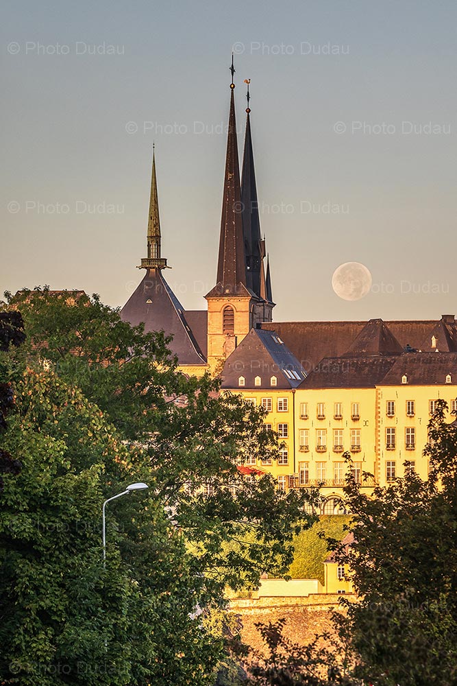 Commercial photo of full moon moonset over Notre Dame Cathedral during sunrise in Luxembourg city.