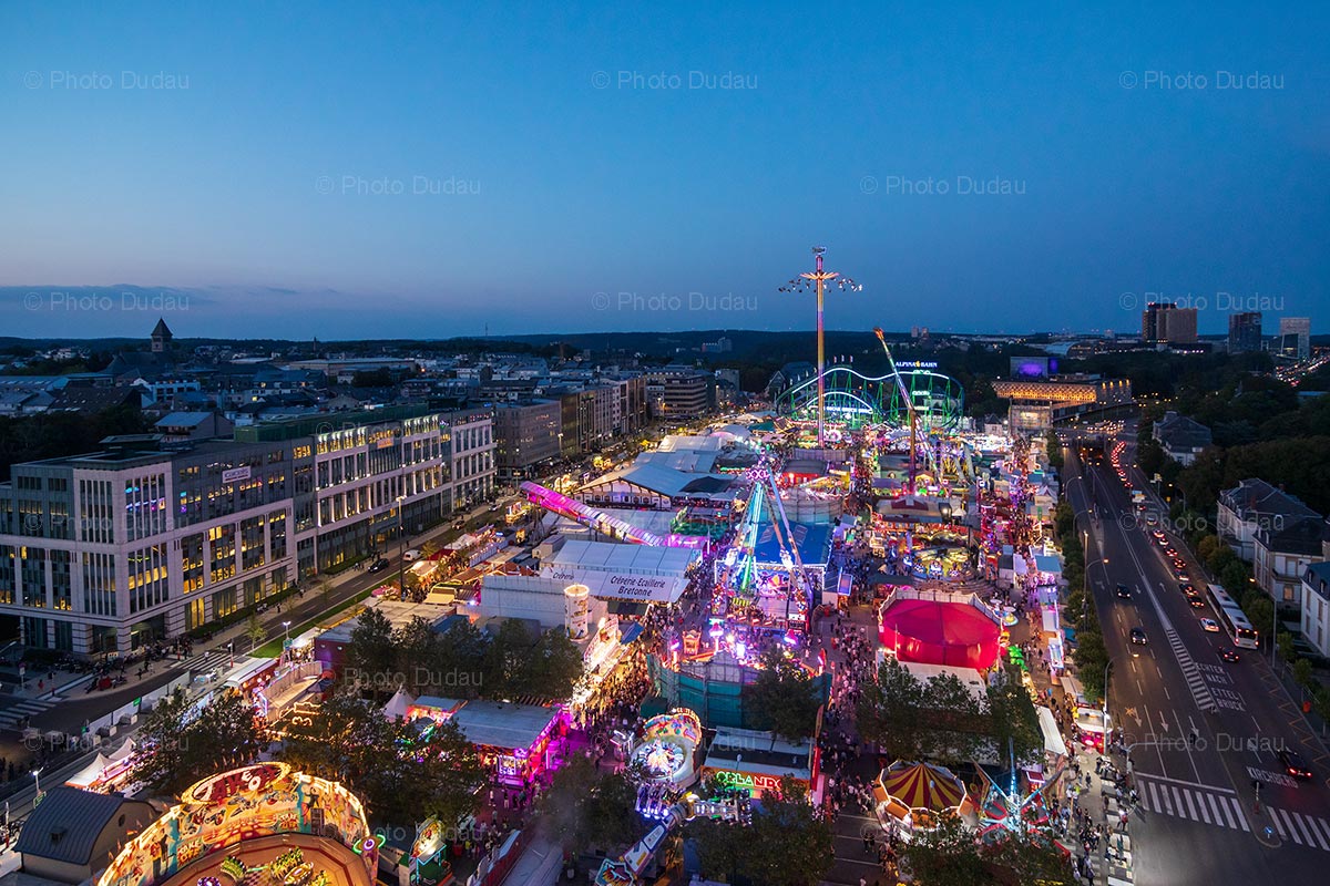 Editorial photo of aerial view of Schueberfouer fun fair in Place Glacis, Luxembourg city during night.