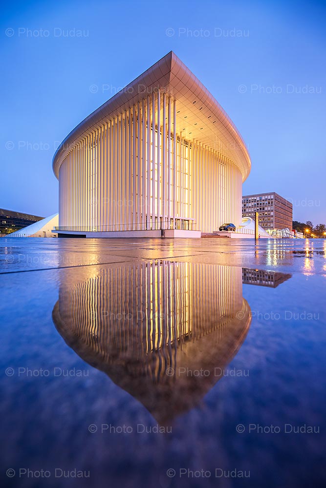 The Grande-Duchesse Joséphine-Charlotte Concert Hall, or Luxembourg Philharmonie (Philharmonic) in Kirchberg, Luxembourg city during a rainy night at blue hour, reflected in rain water.