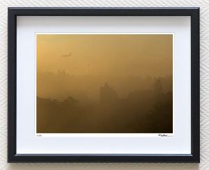 Commercial stock image of airplane flying over Hollow Tooth of the Bock Casemates (Dent Creuse or Huelen Zant) in Luxembourg city, during a foggy morning sunrise.