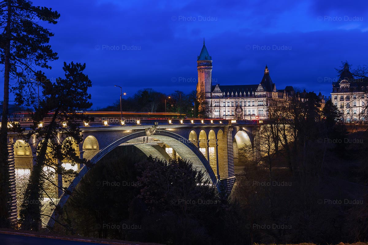 Commercial photo of illuminated Luxembourg landmarks: Pont Adolphe bridge and Spuerkeess Bank tower (State Savings Bank or BCEE) in Luxembourg city during night.