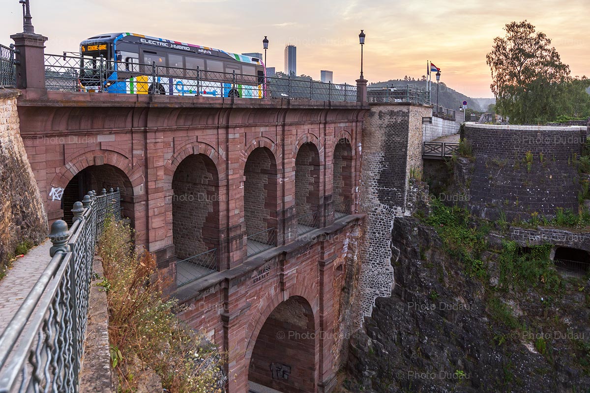 Editorial photo of Multiplicity public transport bus in Luxembourg city, driving on Castle Bridge.