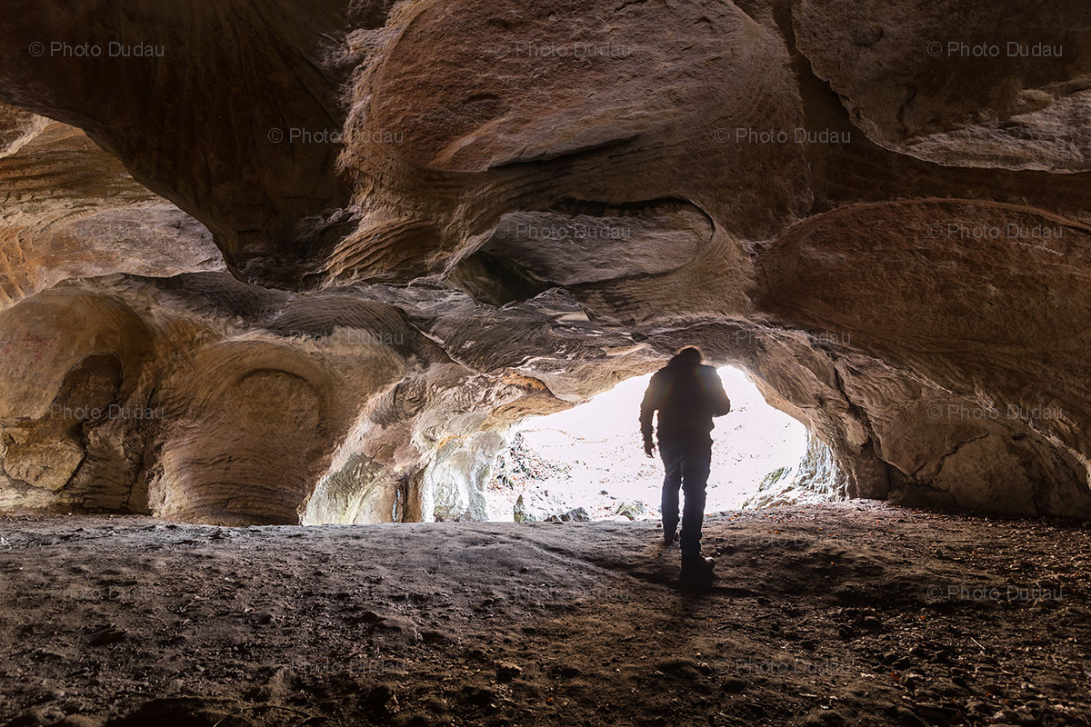 Commercial photo of man visiting rock formations of Berdorf Cave in Mullerthal region (Little Switzerland) of the Grand Duchy of Luxembourg.