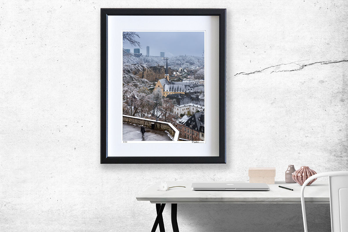 Commercial photo of Luxembourg city under snow in winter – Grund seen from above with Neumunster Abbey, Bock Casemates and Kirchberg in the far left. Shot on 1 December 2017.