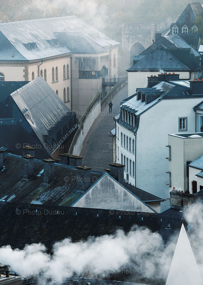 Commercial urban photo of man walking on the street in the old town in Luxembourg city.