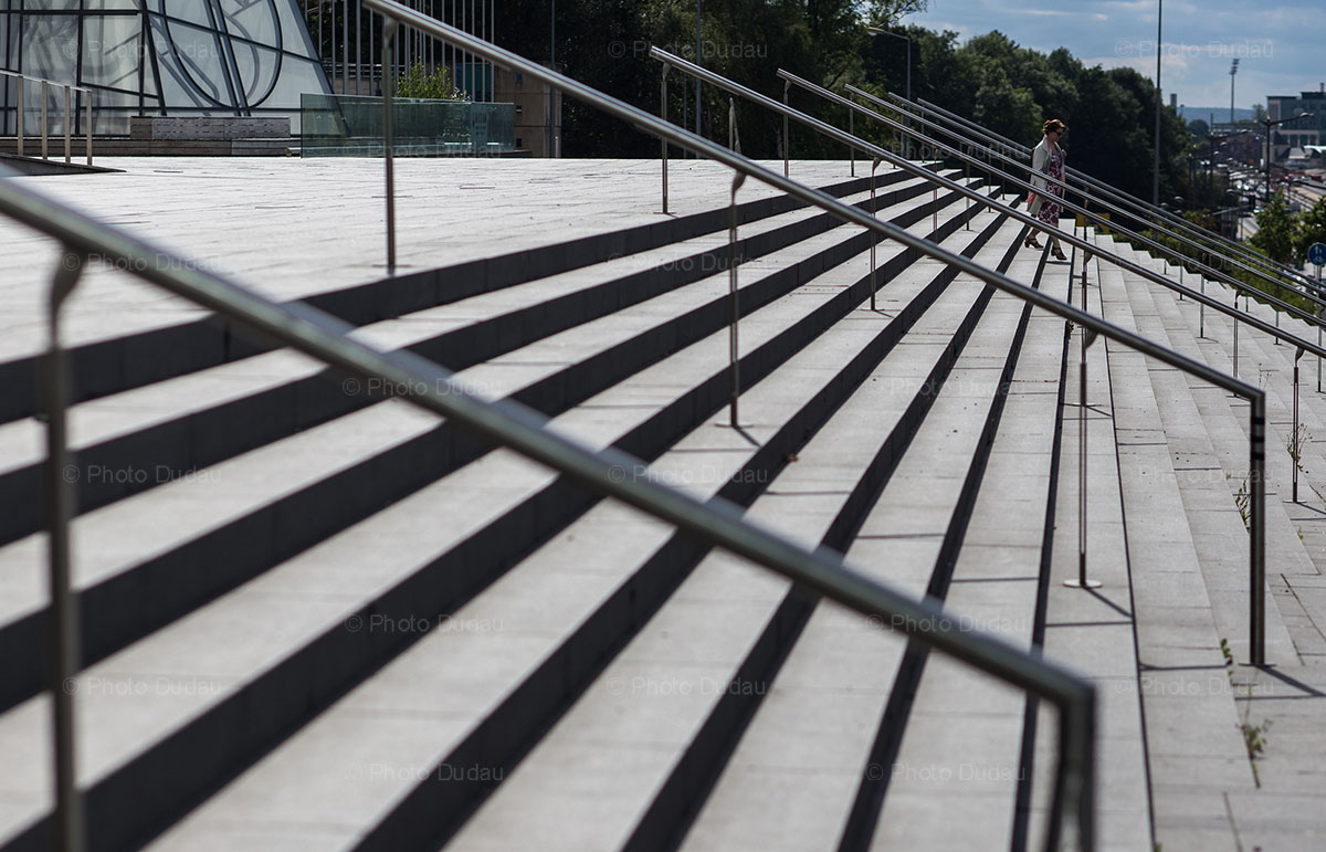 Editorial image of street scene of woman descending stairs at Philharmonie in Luxembourg city.