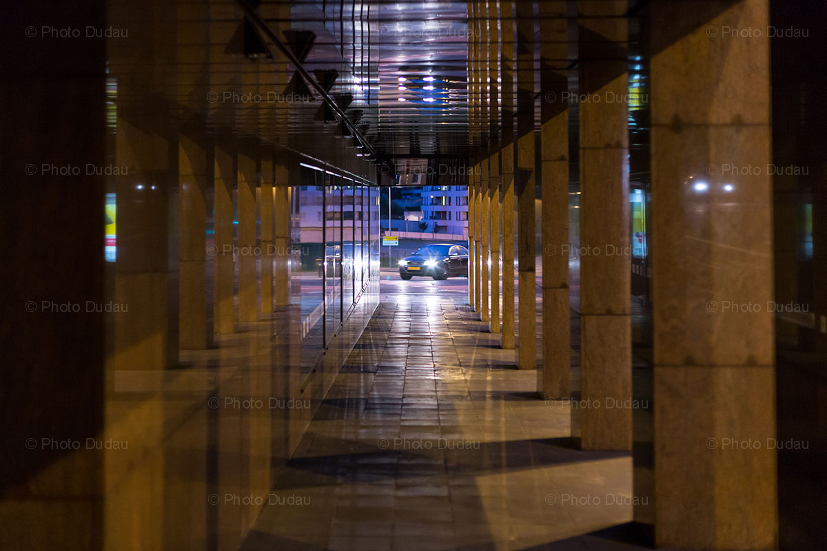 Commercial stock photo of car seen through columns of office building during an evening in Luxembourg city.