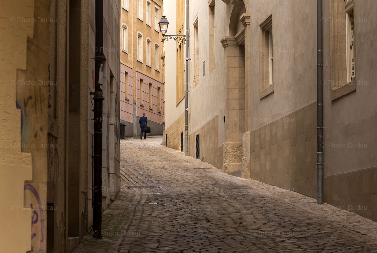 Commercial stock photo of man walking on narrow cobbled street in Luxembourg city.