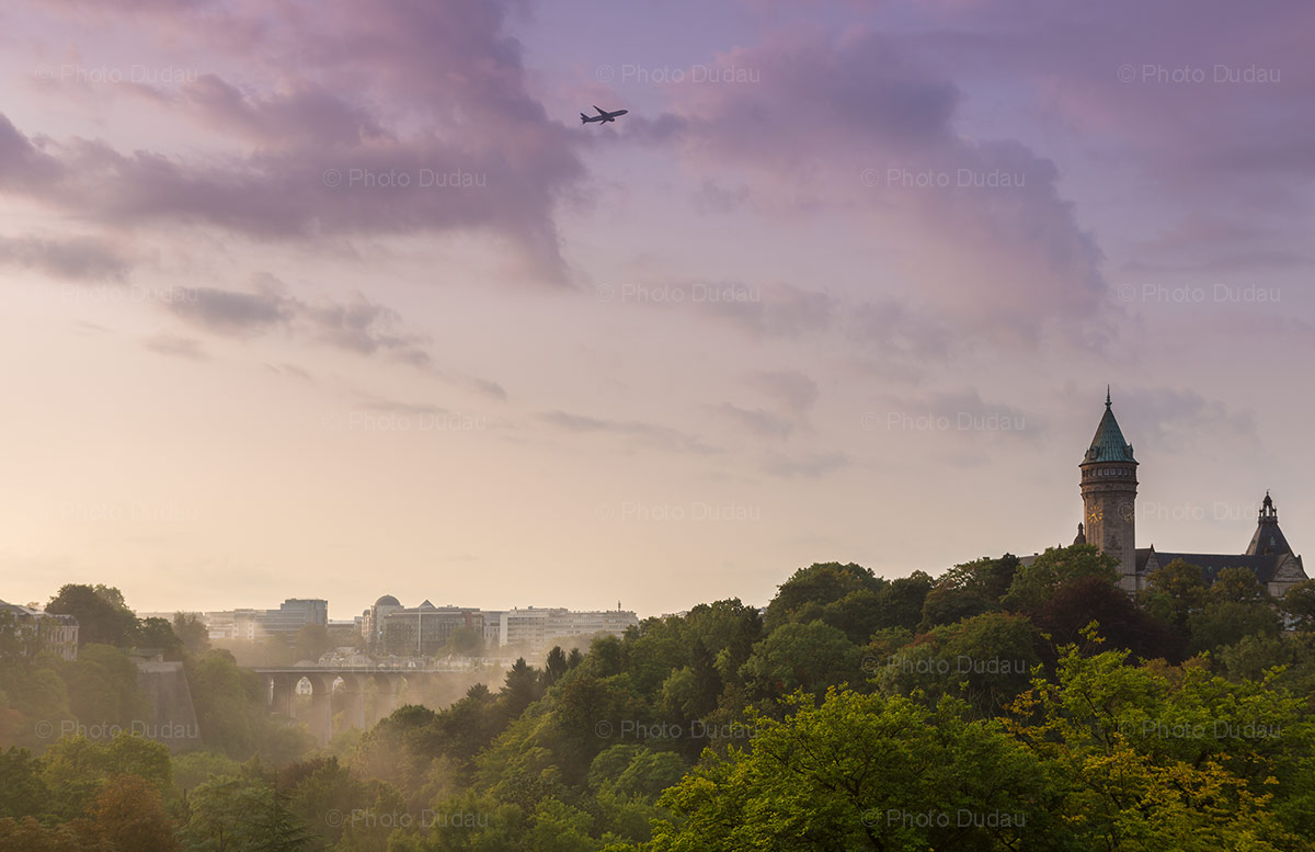 Commercial stock photo of Airplane flying over Grund in Luxembourg city. Spuerkess tower and Passerelle bridge over Petrusse Valley are visible during sunrise.