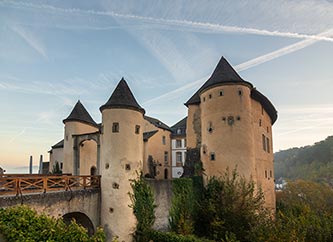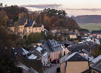 Commercial photo of Bourglinster town with Bourglinster Castle in the Grand Duchy of Luxembourg.