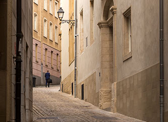 Street photography scene with man walking on old alley in central Luxembourg city.
