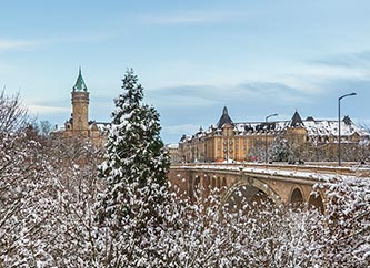 Spuerkeess tower and Pont Adolphe under snow during winter in Luxembourg city