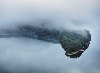 Foggy Upper-Sûre lake in Luxembourg during summer