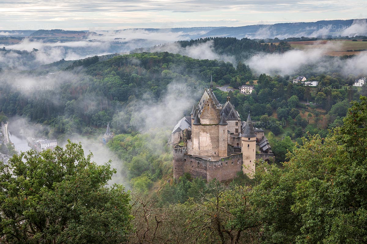 Commercial photo of Vianden Castle in Ardennes region of Luxembourg, seen from above during a foggy morning.