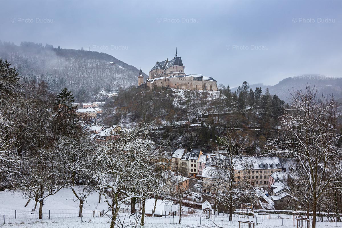 Commercial photo of Vianden Castle and town in Ardennes region of Luxembourg, under snow in winter.