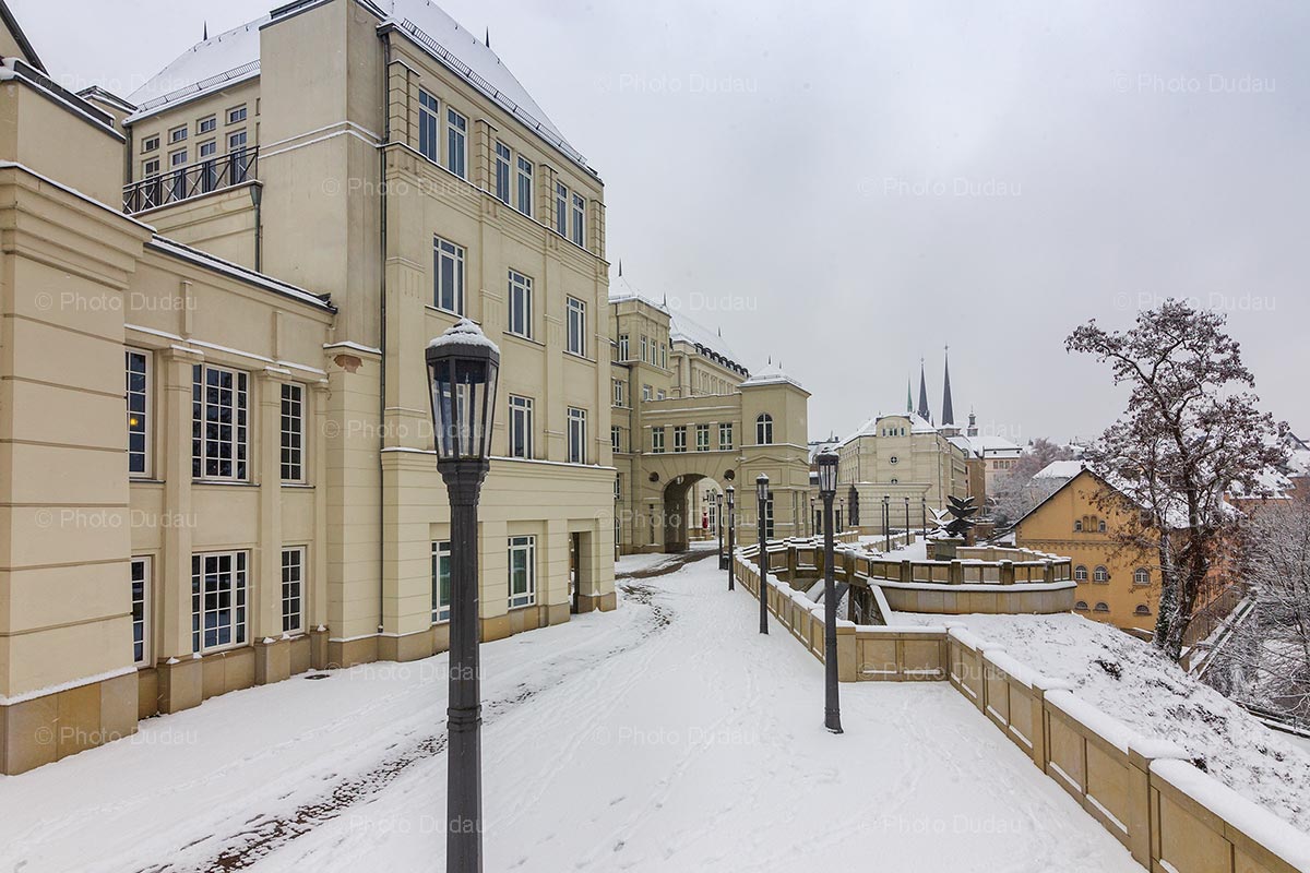 Commercial photo of administrative buildings at Cite Judiciare – Justice Quarter in Luxembourg city under snow during winter.