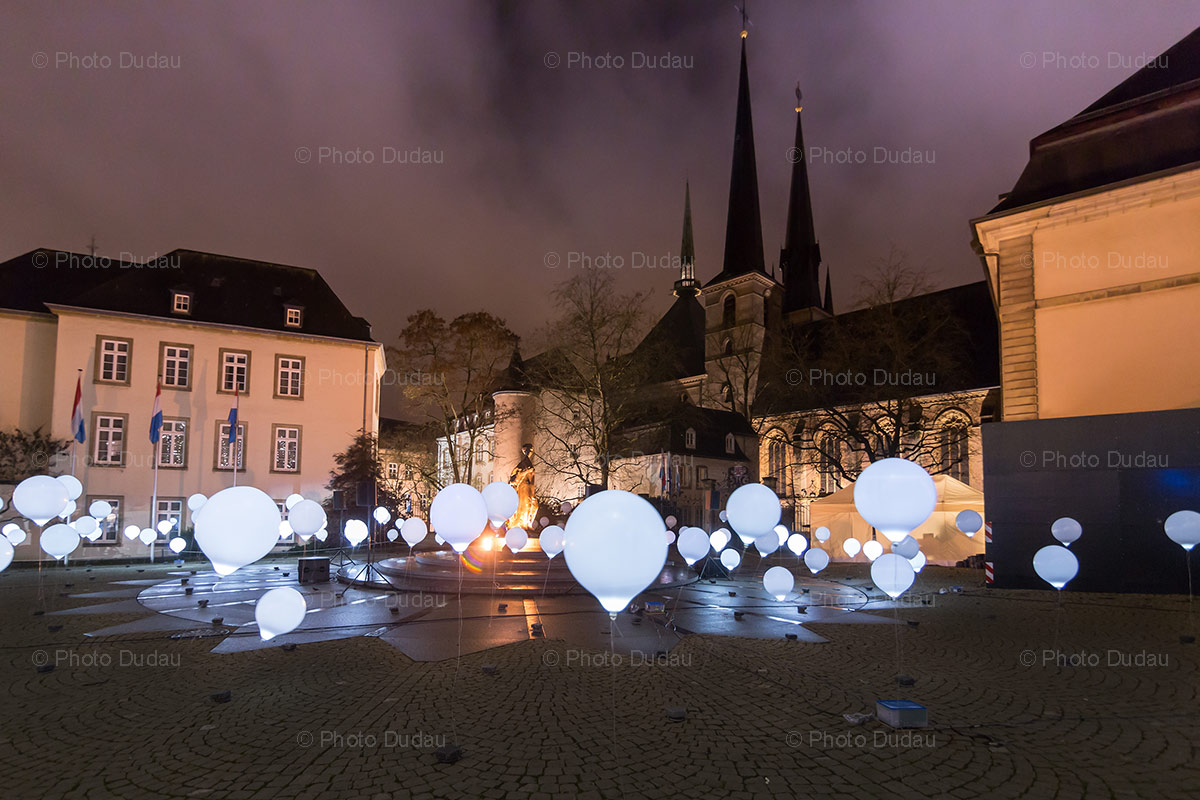 Editorial photo of lights installation on central street in downtown Luxembourg city during Winterlights festival on 15 December 2017, with Notre Dame cathedral in background.